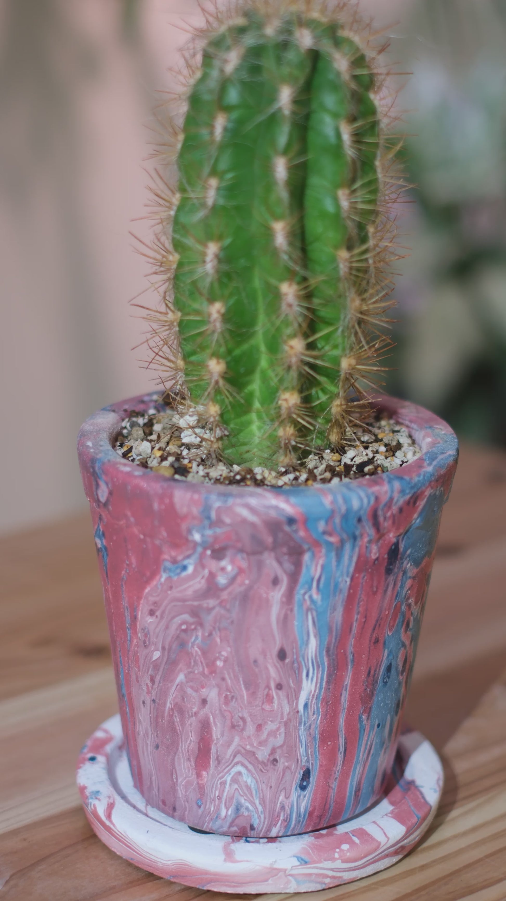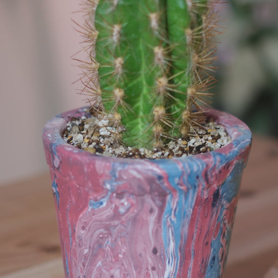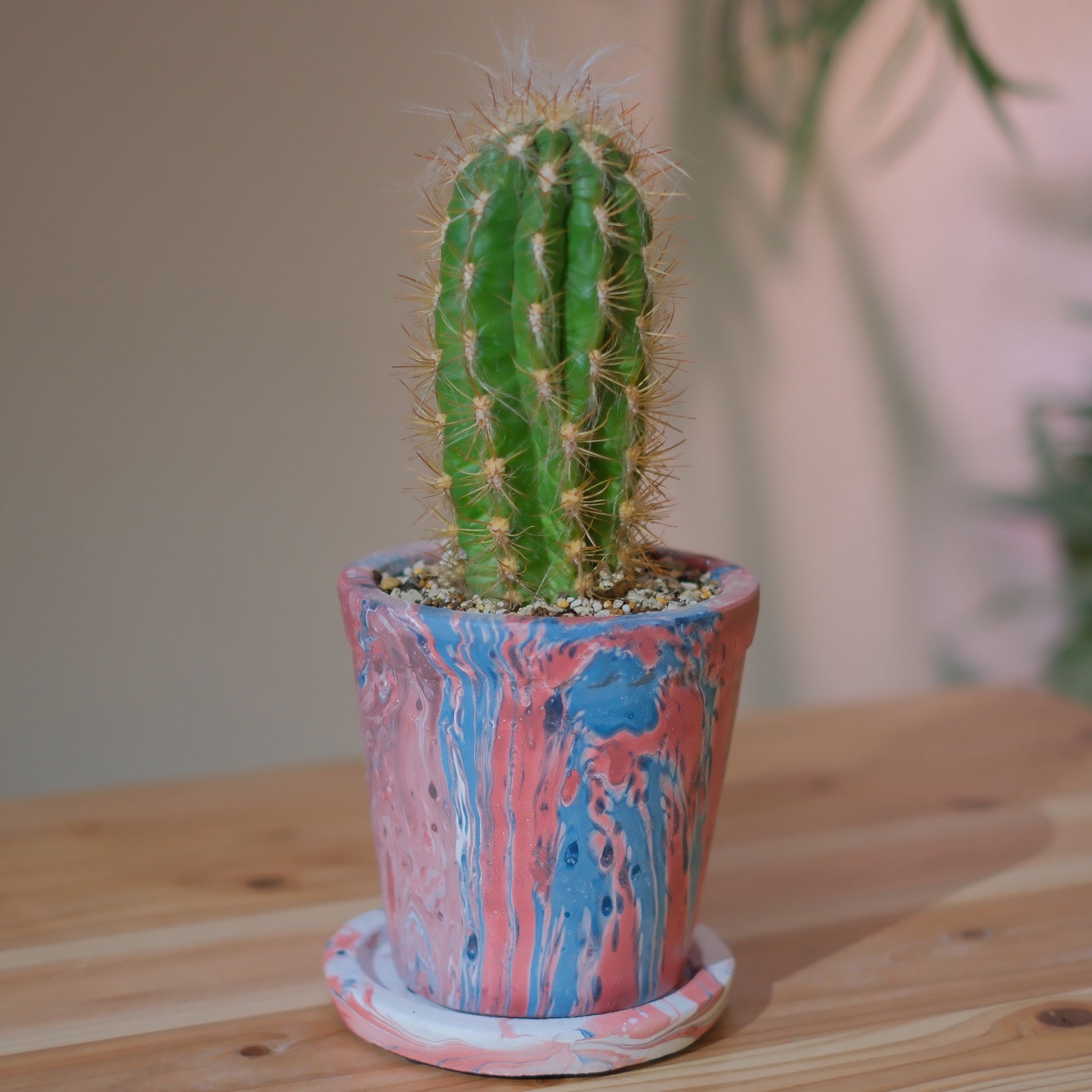 柱サボテン ライオン錦|マーブルテラコッタ 赤×ブルー|アンティーク加工・皿付き【GORI STORE TOKYO】