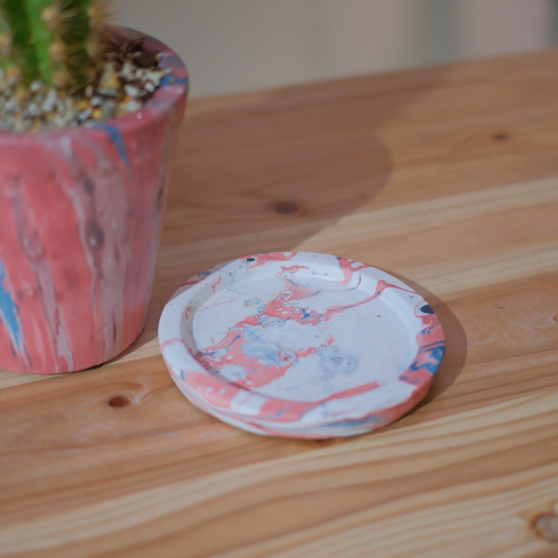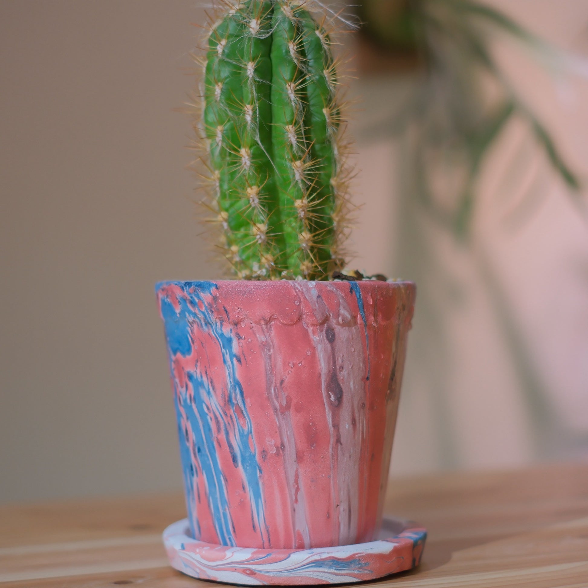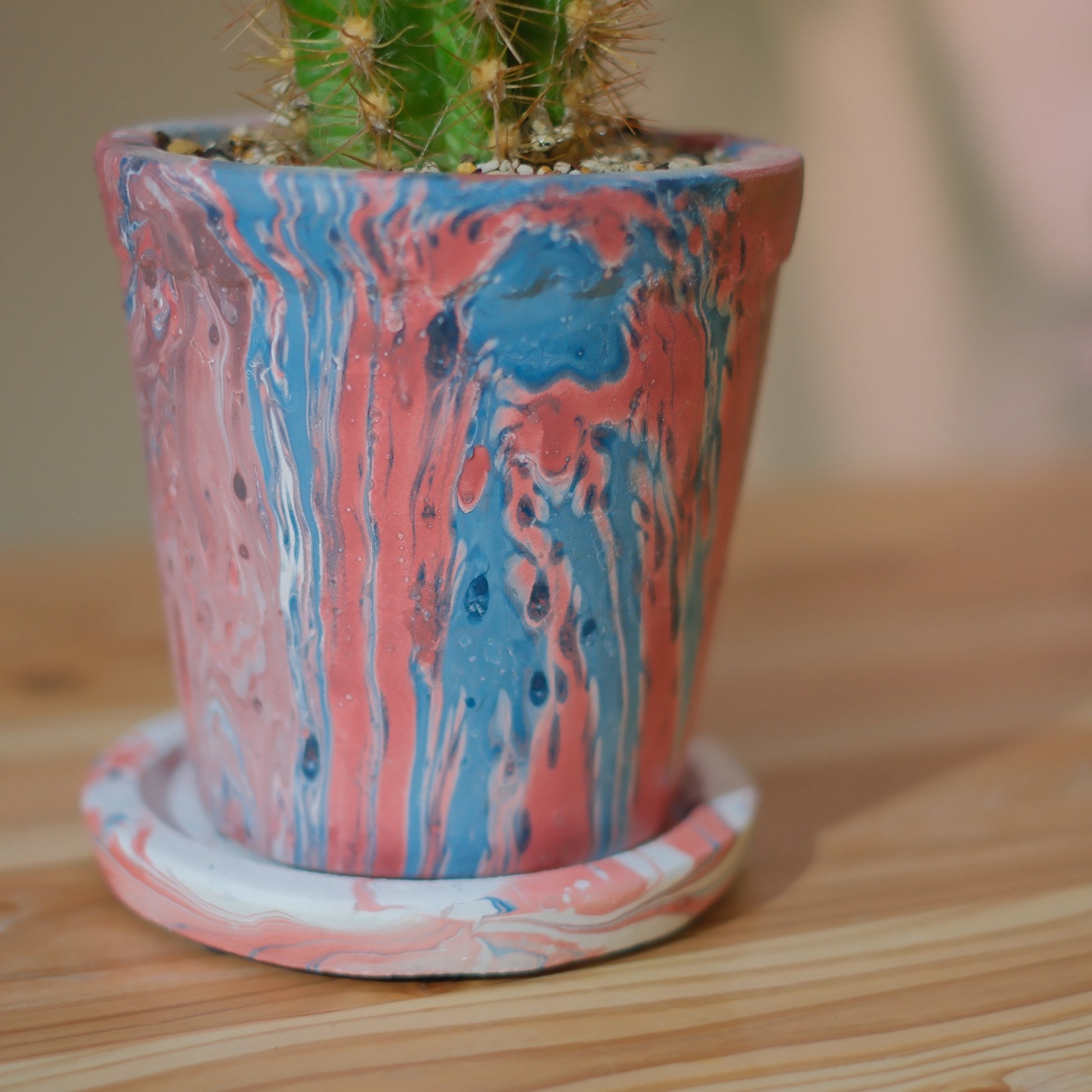 器には、**マーブル模様のテラコッタ鉢(赤×ブルー)**を採用。