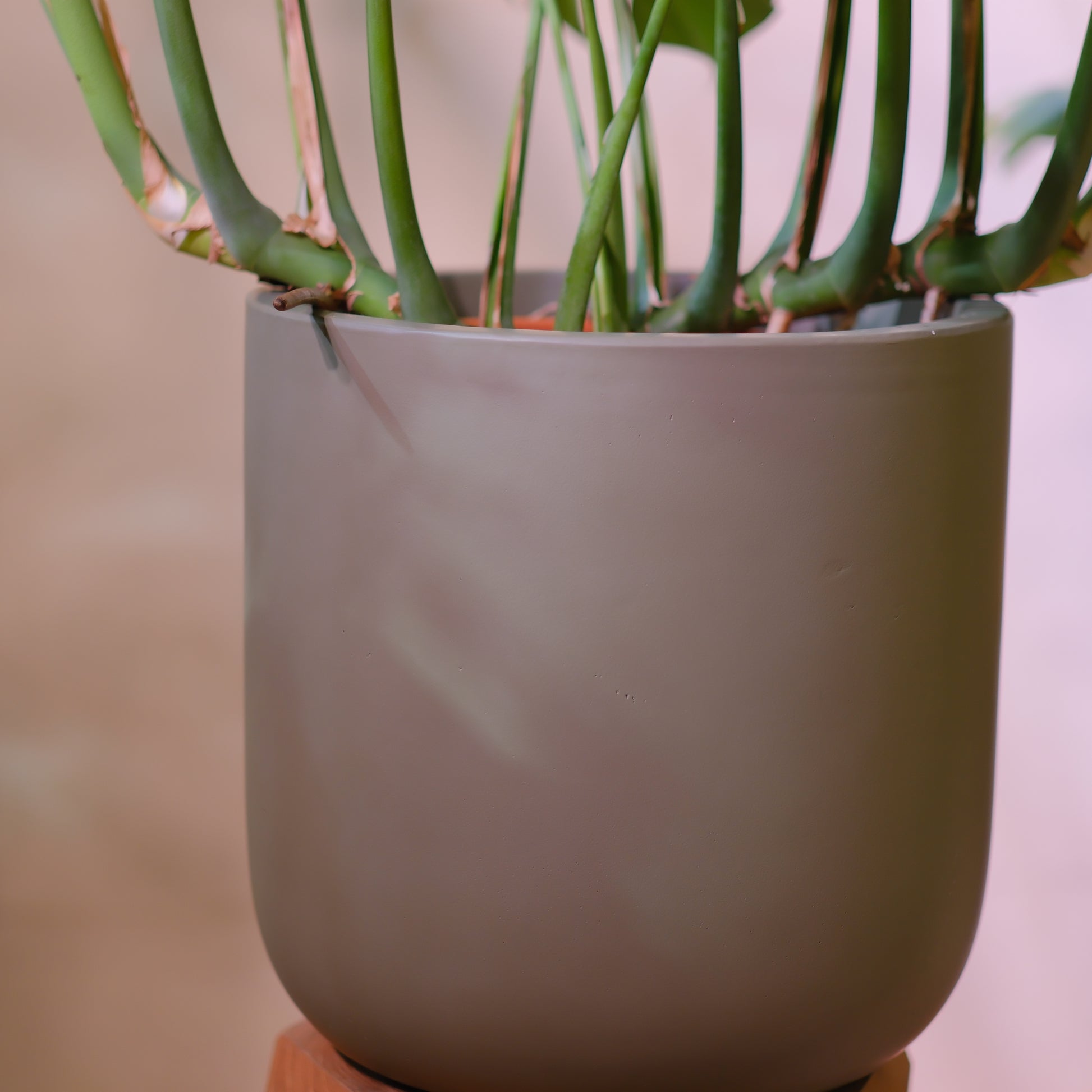 付属の モスグリーン陶器カバー は、重厚感と安定感のある仕上がりで、モンステラのワイルドな姿をより際立たせる上質な器。リビング・オフィス・サロンなど、どんな空間にも調和し、存在感あるインテリアグリーンとして活躍します。